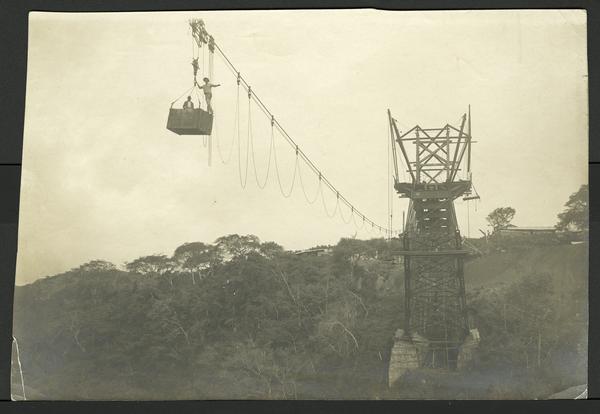Bridge construction in Costa Rica: 2 men suspended in a high cart