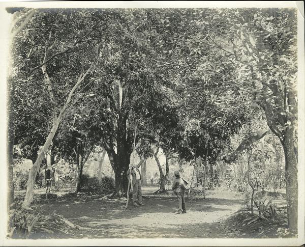 Two men looking up into tree