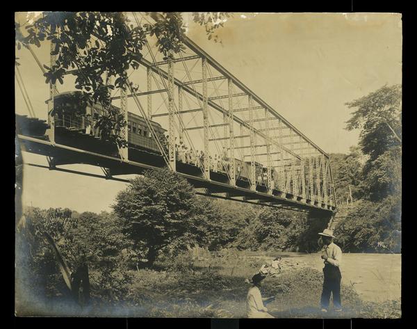 2 men and a lady under the bridge while a train goes over the bridge
