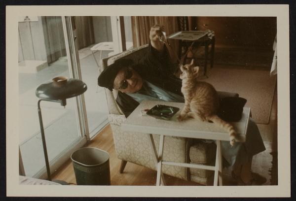 Snapshot of Peggy in old age with a cat