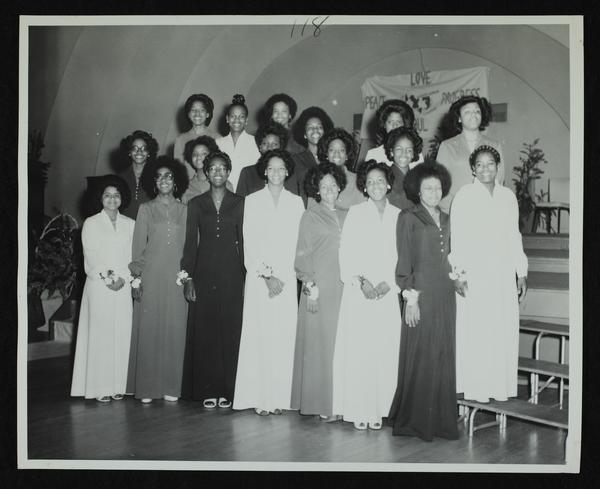 Unidentified group of nineteen debutantes arranged in three rows to right of stairs to stage with Links sign hanging in rear