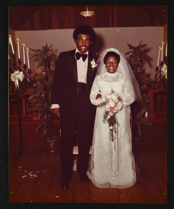 Unidentified groom and Shell Vontreso wedding at Mount ? Church (Reception at Clover Center)