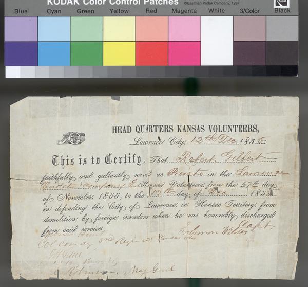 Certificate, Head Quarters Kansas Volunteers