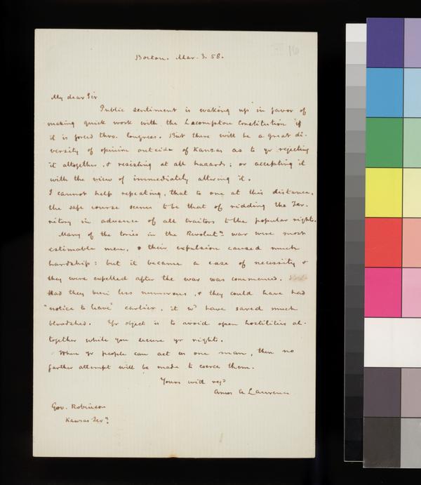 Letter, Amos A. Lawrence to My Dear Sir [Gov. Charles Robinson]