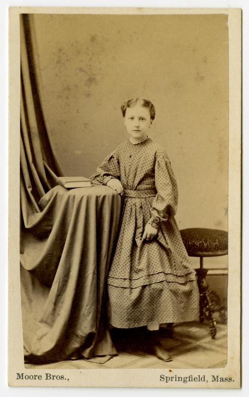 Photo of a young girl with dotted dress, book on side table
