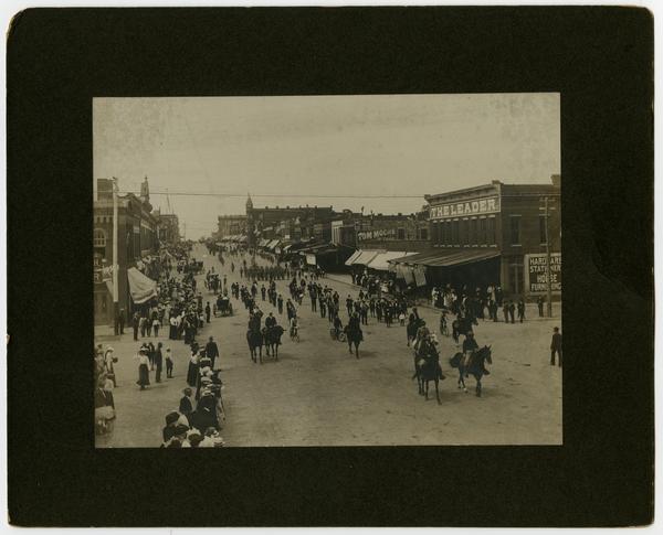 Parade scene of men on horses, buggies, and boys on bikes (Grand Army of the Republic leading the procession) (Semi-Centennial Parade)