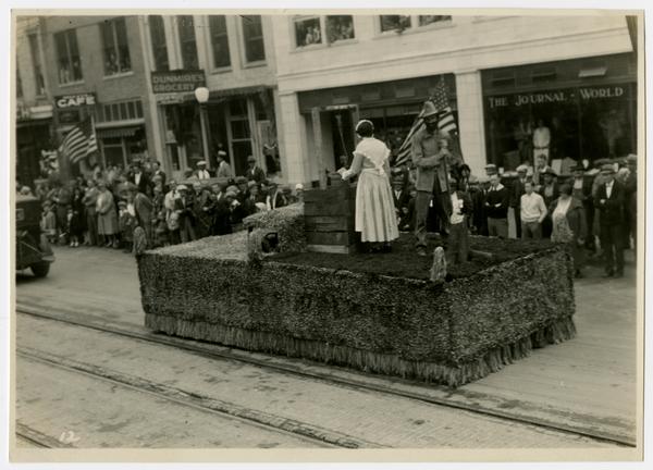 People dressed as pioneers float (75th Anniversary Historic Parade)