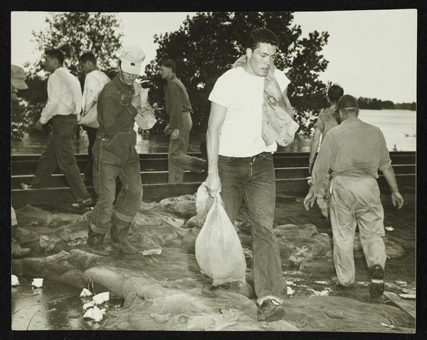 Men sandbagging by railroad tracks (1951 Flood)
