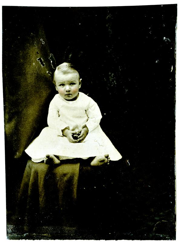 Photo of an infant with blushed cheeks in a white dress