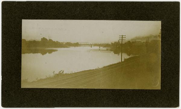 Looking east towards second bridge and Bowersock Mill and south bank at sunset, before 1903 flood