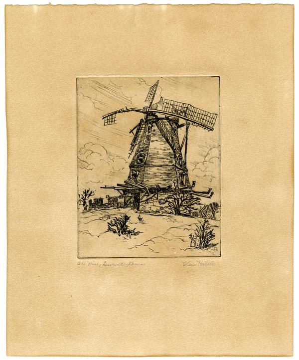 Etchings of windmill by Clara A. Hatton