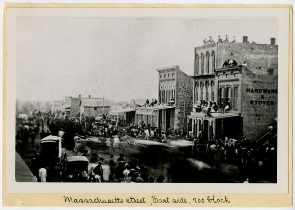 Massachusetts Street, 700 block, east and west sides with crowd