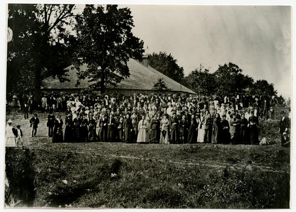 Groups of men and women in front of Bismark Grove Tabernacle