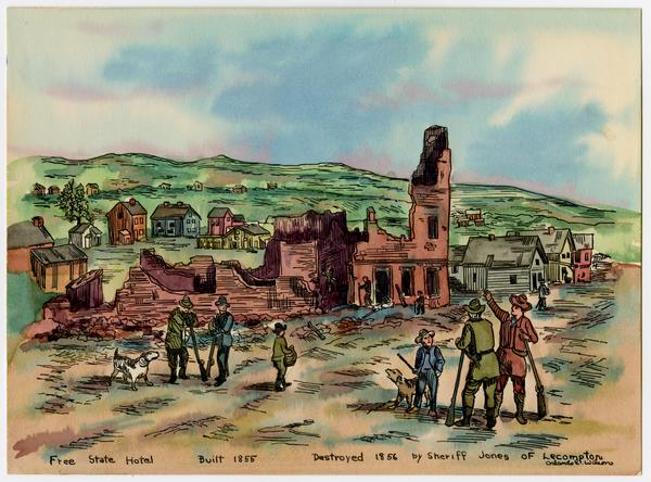 Sack of Lawrence - ruins of Free State Hotel [watercolor by Orlando E. Wilson]