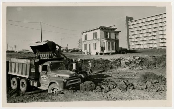 W. Z. Dunbar and Son, construction workers digging foundation for University of Kansas dorms on Iowa Street, house being moved