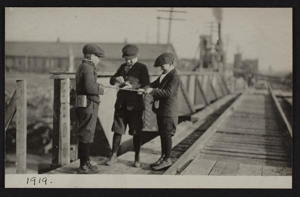 Views at railroad bridge and water treating plant; Junior and Cooky; views of new cement viaduct arch