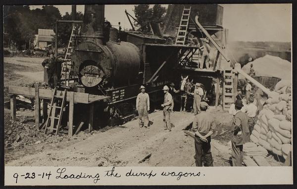 Applying asphalt coat to Front Street; view of asphalt plant; roller stuck on Main St.