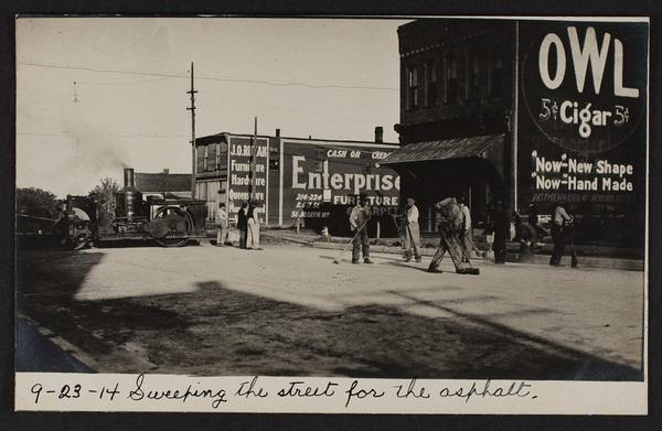 Applying asphalt coat to Front Street; view of asphalt plant; roller stuck on Main St.