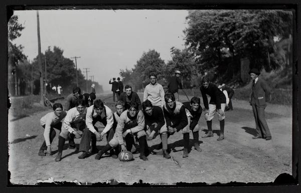 Football team in street, 1895