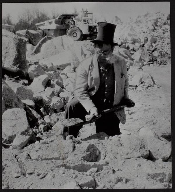 Gold Rush - at construction site near Freetown, MA - James C. Ashley wearing hat his father wore in 1949 gold rush.