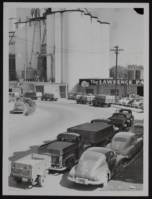 Wheat Harvest - Grain trucks waiting to unload at Bowersock Mills.