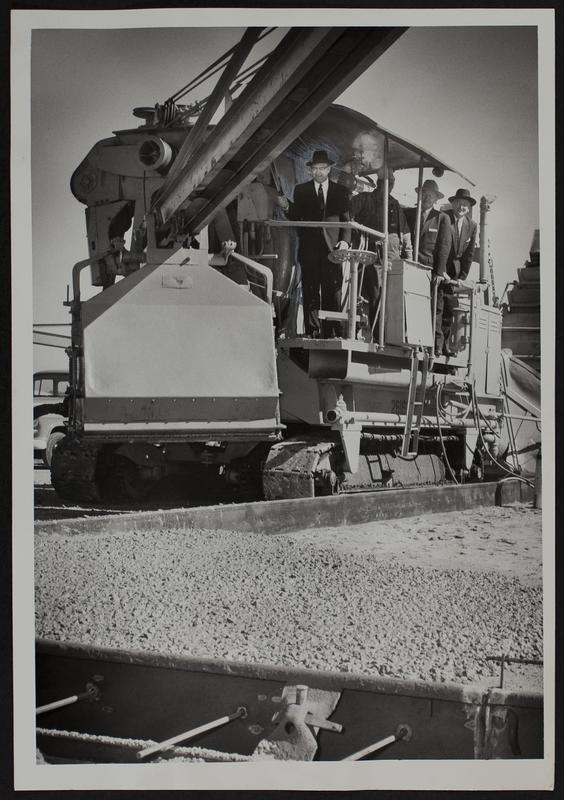 Kansas Turnpike - Gov. Fred Hall dumps first concrete for turnpike from mixer near Big Springs.