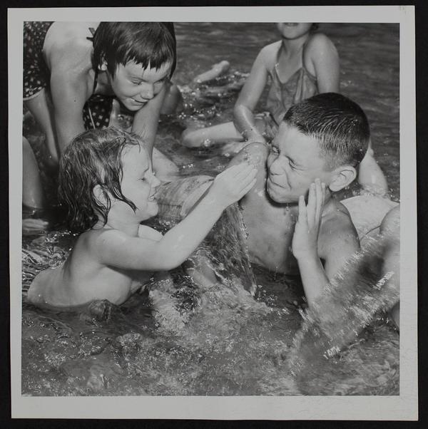 Lawrence recreation commission - wading pool in South Park - Candy Kay Allen splashing Bud Gillespie, Jr.