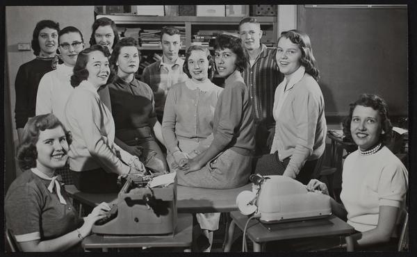 LHS Business Students (L to R) Dorothy Carey (seated); Mary Ann Pohl; Rebecca Hellstrom; Connie Marsell; Carol Collins; Gloria Savage; Fred Johnson; Darlene Daniels; Mary Chavez; Paul Findlay; Julie Bolton; Leota Rake.