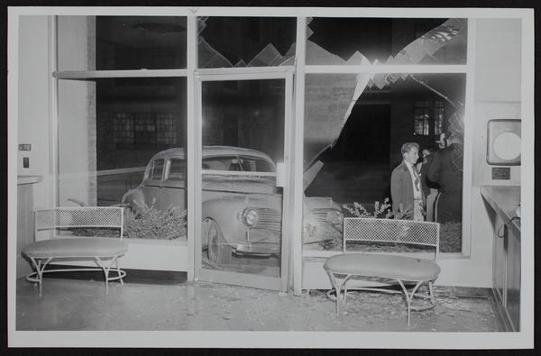 Auto wrecks - Damage to front door of Journal World building - Lawrence B. Brouhard, Eudora.
