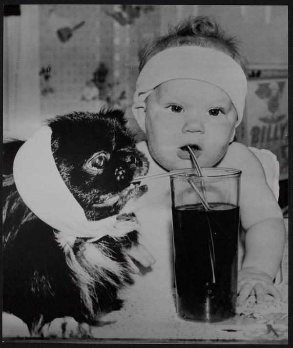 One way to beat the heat. little Georgeann Levon of Pottstown PA and her dog, Mike, wrap in wet towels and drink.