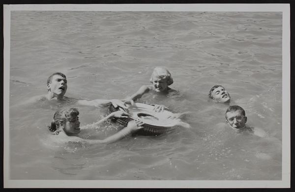 Summertime safety - Demonstrating spare tire as life preserver (L to R) Martha Hammig; Morris Springer; Julie Harner; Gary Creamer; Raymond Schwegler.