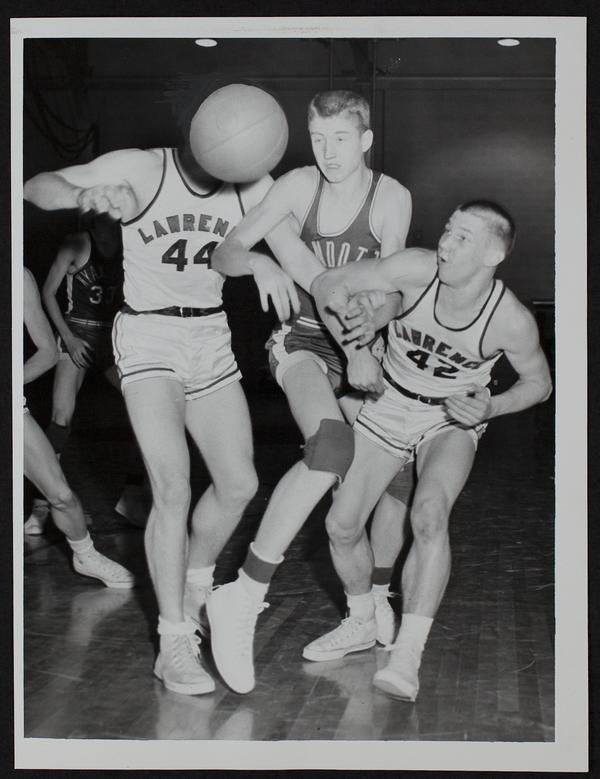 LHS basketball - Jaydee Stinson (behind ball) and Joe Malott and Wyandotte's Larry Comely.