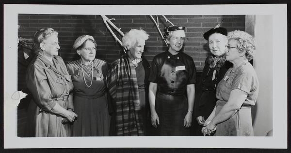 American Association of University Women - 50th anniversary celebration (L to R) Mrs. Roy Moore; Mrs. F. P. O'Brien; Dr. Margaret Justin, Manhattan; Mrs. B. A. Gessner, Baldwin, Pres. Kan. Div.; Miss Agnes Thompson; Mrs. Joseph Murray.