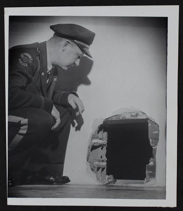 Patrolman Roy Bledsoe inspects hole made by burglars.