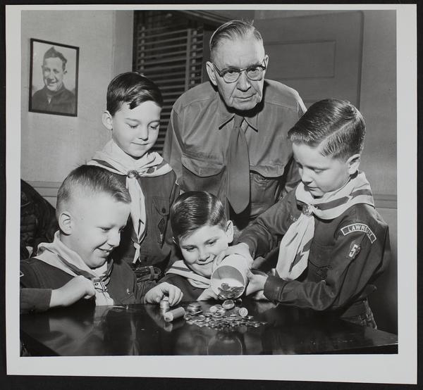 March of Dimes - Cub Scouts collection (L to R) Gary of Spray; Stephen Brown; Corwin Byrn; Fred J. Brown (leader); Bobby Crown.