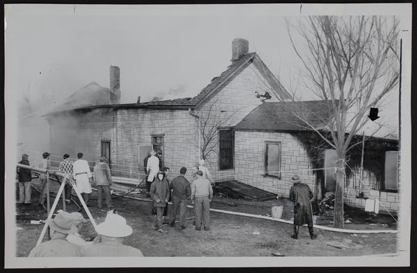 Fires - Tonganoxie - where three children died - Children of Mrs. and Mr. Richard Skaggs. (A) General view of rear of building. (B) Fred Needham looks over Skaggs bedroom. (C) Tonganoxie, Linwood and Basehor firemen and front of building in Downtown. (D)
