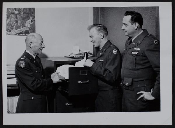 National Guard - Local unit of Company H 137th infantry regiment - inspection by Lieutenant Colonel Duke Bryant, Chicago (Left); CWO Don Ousdhal (center) and Captain Karl H. Reber.