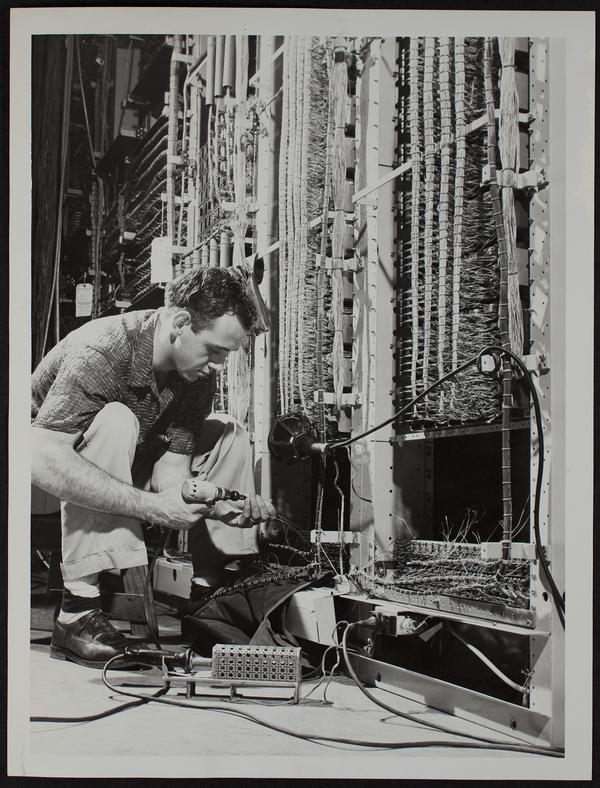 JD Fortner of Springfield, MO. Working on equipment for change of telephones to dial.