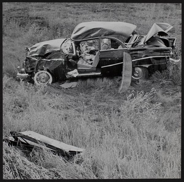 Auto wrecks - Damaged auto after rolling down embankment six miles west of Lawrence - Melvin Dale Wedel and Irene Smith, both of Burns, KS injured.