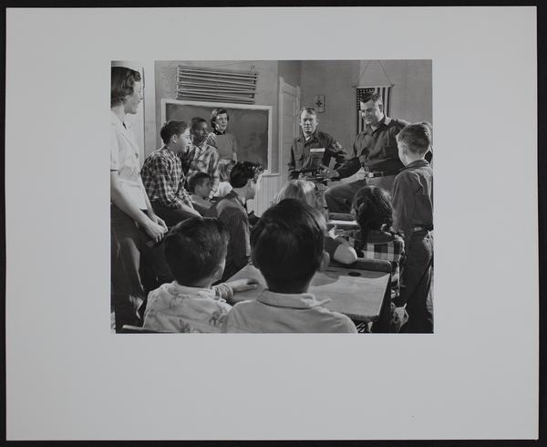 Forbes Air force base - Survival School - lecturing to Apple Pie rural school. Master/Sergeant Martin V. Medley (left) and T/Sergeant Kenneth Borders - Miss Jane Anderson Teacher.