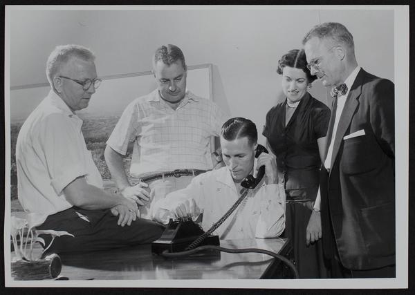 Dial Phones (L to R) City Manger Jim Wigglesworth; E. R. Cook, chamber of commerce; Mayor John Crown; Mildred Angel, Chief Op.; Owen Smith, local manager for Southwestern Bell.