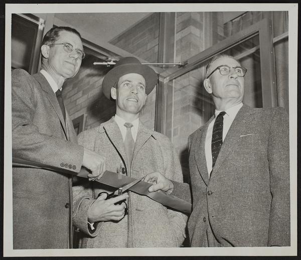 Santa Fe railroad station - opening (L to R) John Landreth, general manager Santa Fe Eastern lines; John Crown, Mayor; Ellis P. Addy, local station agent.