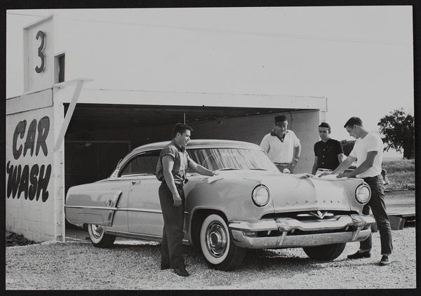 Baseballers work for their money. Jr Legion players wash cars at Bill Wigglesworth's new car wash at 2301
