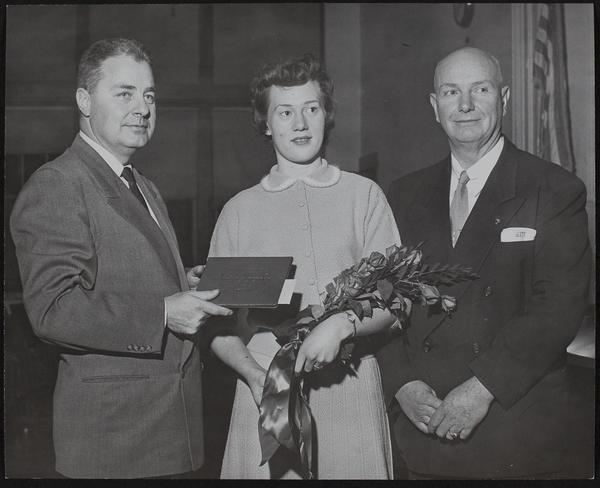 Kansas Homemaker of Tomorrow - Award to Sally Bartlett, McLouth; E. R. Zook, Sec. Law. Chamber of Commerce and (right) Cecil M. Luse, Mayor of McLouth.