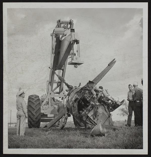 Pilot Lt. John T. Dixon, Wichita, was pulled from this burning navy plane near Olathe by John R. Newbold and Howard W. Seliff.