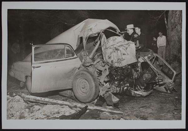 Auto wrecks - two killed at Pleasant Grove - Wyona May Hurst and Elmer G. Boyd. Sheriff's deputy Rex Johnson and Clarence Buller at car.