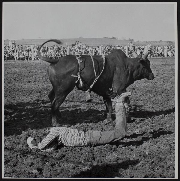 Haskell - Rodeo Haskell Indian Dance Club - group - Brahma bull and thrown rider. Bucking horse throwing rider.