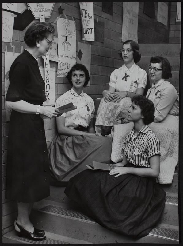 Girl Staters (Clockwise from Left) Mrs. Iona Cahoon, Parsons; Sandra Kay Lee, Lawrence; Cora Lee Prize, Lawrence; Nannette Billings, Wakeeney; Ann Bruning, Robinson.