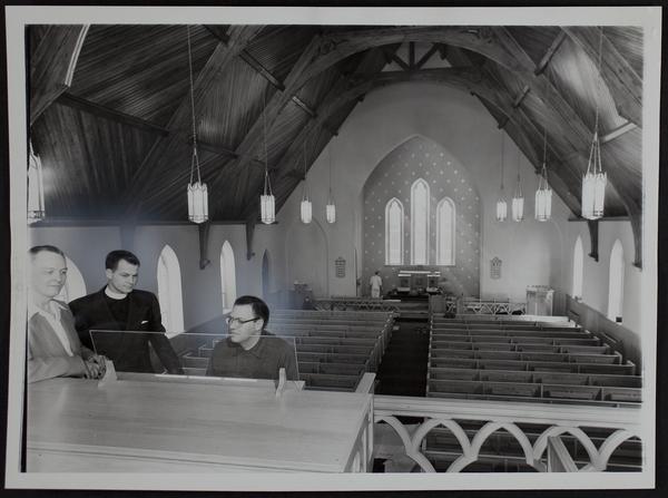 Lawrence Churches - Episcopal - readying for first service since fire (L to R) Frank Green, music director; Robert Swift, pastor; C. J. Tilton, tuning the organ for the Reuter Organ Company.