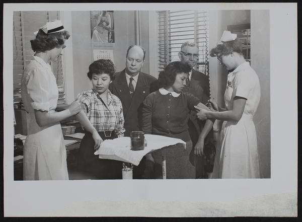 Salk Vaccine - Haskell (L to R) Mrs. Magdalena Dukelow; Ruby Singer; Dr. C. A. McIntyre; Betsy Quesada; Dr. W. O. Nelson; Mrs. Colleta Nelson.